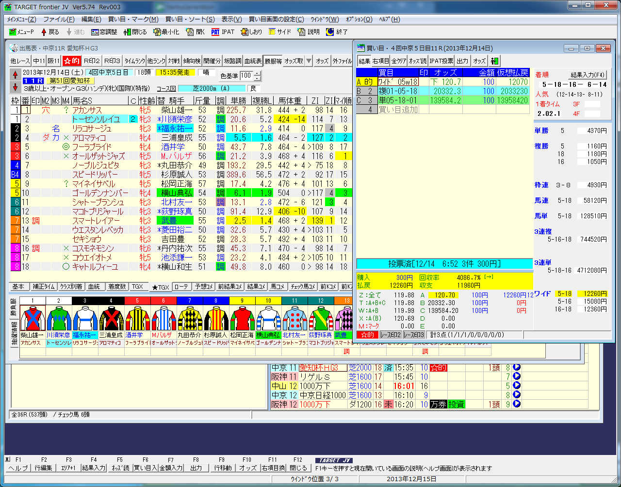昨日は出勤日で朝一で投票してたのですが、実はこの買い目三連単が無投票だったので遊びで買ったのですが、本来買うべきは×を付けた中から一番人気のない買い目って感じにいつもしてたのですが...まあ、出勤してなくて自宅に居て締切近くになっていれば無投票とかでは無かっただろうし、遊び買いしてなかったかどうかは疑問はあります。ここ最近は三連単のオッズで300円か500円勝負してただけに...ここの所ワイ万に見放されてましたし、滅多にあるチャンスでは無いので、次はいつの事かな~^^;